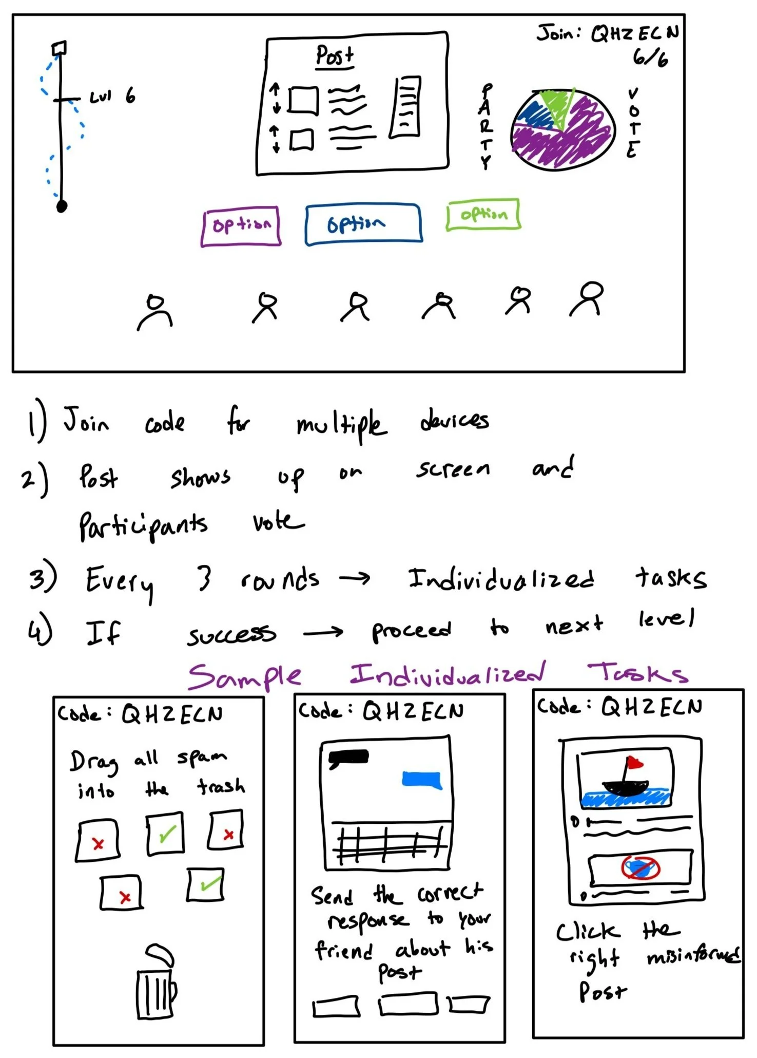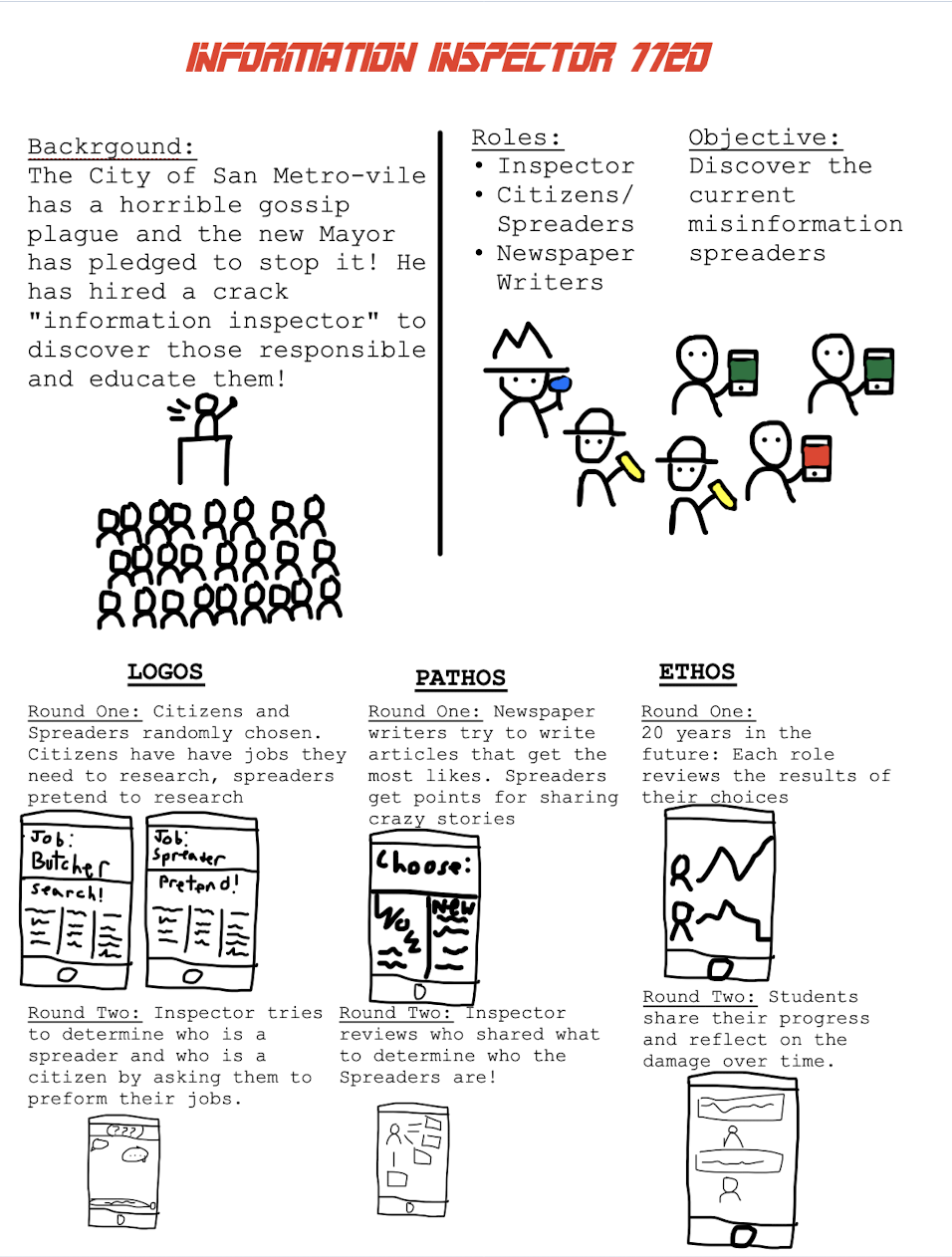 During our ideation phase, we generated a vast array of mini-game concepts that focused on teaching digital literacy concepts related to misinformation. The game takes place across three different worlds themed around pathos (emotion), logos (search for information), and ethos (credibility). For the pathos game, we incorporated a responsive ‘identify the misinformation’ exercise. In the logos game, we aimed to create an immersive maze where "game makers" would control what appeared on the opposing teams’ screen. Lastly, for the ethos game, we wanted to simulate a real-life conversation, similar to a social deduction-style game. Through multiple iterations, we were able to refine these concepts and merge them into three unique, engaging mini-games that would provide a fun and educational experience for students.