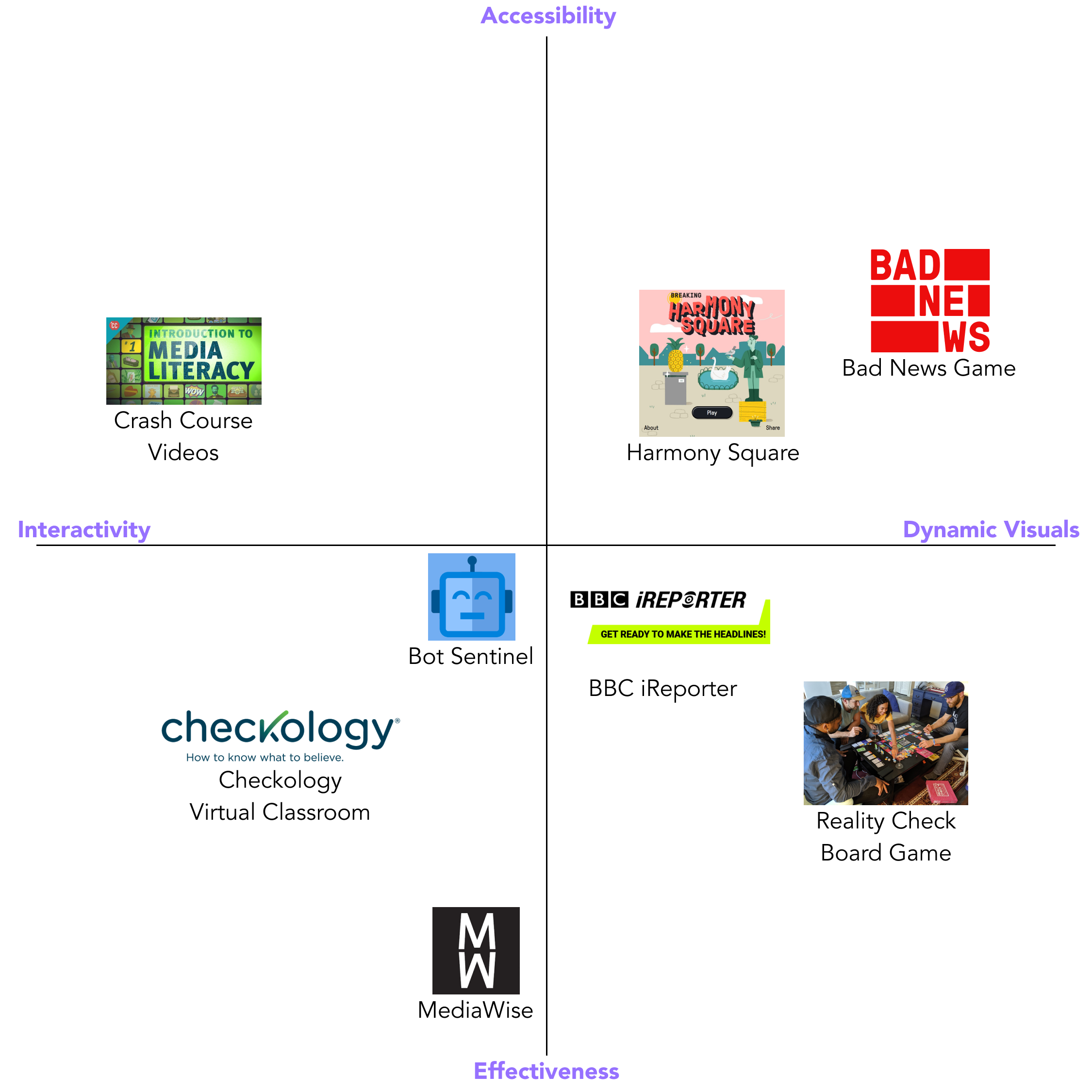 We conducted 8 competitive analyses of existing digital literacy education programs and resources. We looked at a variety of online platforms and apps, as well as in-person workshops and courses. Our analysis focused on two main axes: accessibility/effectiveness of communication and interactivity/engaging visuals. By analyzing these programs, we were able to identify gaps and areas where our project could improve upon existing solutions. We also gained insights into successful strategies and tactics that we could incorporate into our solution to better serve our target audience.
